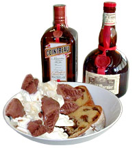 Disporre la gubana affettata insieme a del gelato al cacao o alla vaniglia, ed innaffiare il tutto con del Cointreau e/o del Gran Marnie.