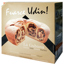 Alla tradizionale gubana abbiamo aggiunto del cioccolato fondente nel ripieno in onore di Udine, capitale del Friuli. Abbiamo pensato a una cartolina come scatola che descriva alcune bellezze della città. Ideale regalo gastronomico tipico locale.